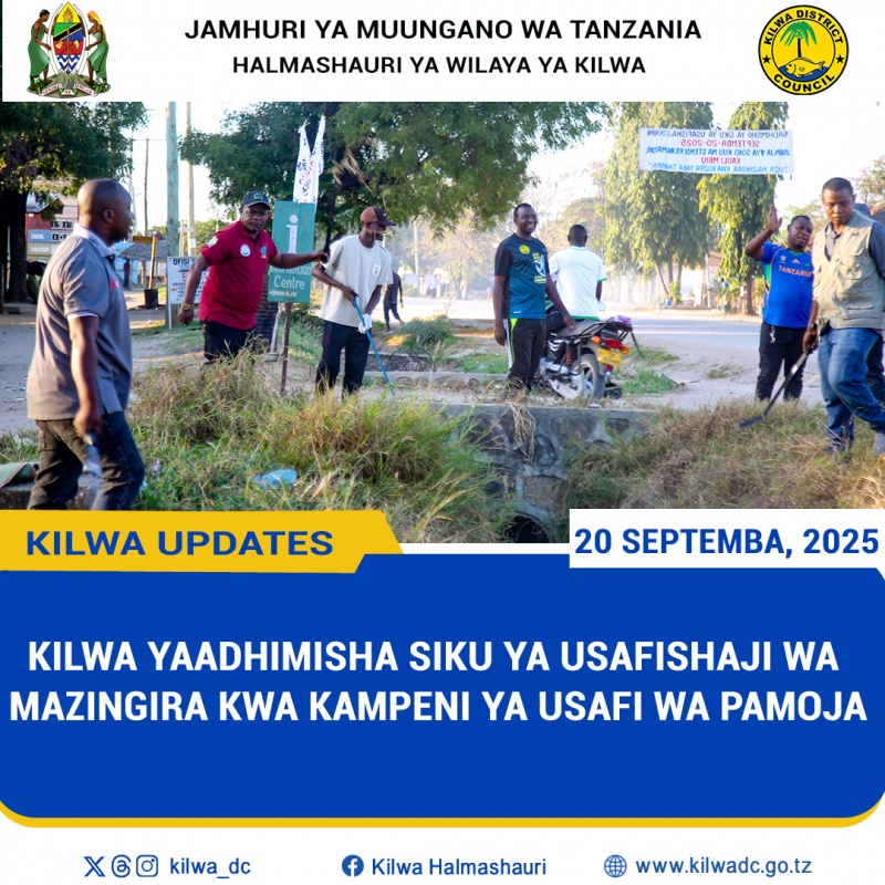 Wilaya ya Kilwa imeungana na mataifa mengine duniani kuadhimisha Siku ya Usafishaji wa Mazingira Duniani ambayo hufanyika kila mwaka tarehe 20 Septemba, kwa kufanya shughuli mbalimbali za usafi katika maeneo ya stendi za mabasi na barabara kuu. Zoezi hilo limefanyika tarehe 20 Septemba 2025, likihusisha wananchi kutoka kata mbalimbali kushiriki kikamilifu katika kufanya usafi wa pamoja.